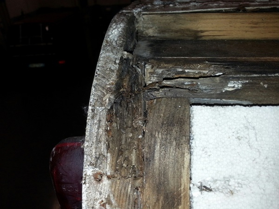 Come è possibile vedere nel lavoro documentato in seguito, l'acqua è filtrata attraverso crepe nella plastica del cupolino ed è andata ad intaccare il legno sottostante facendolo marcire, mentre sui pannelli di polistirolo si sono formate macchie di muffa.